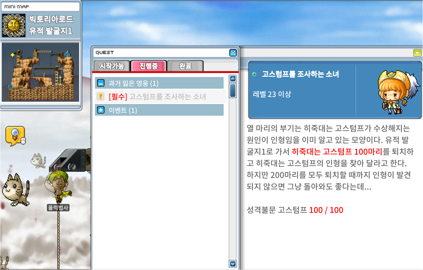 유적발굴지1로 이동해 히죽대는 고스텀프 100마리 잡아주고 인형을 구해오자!