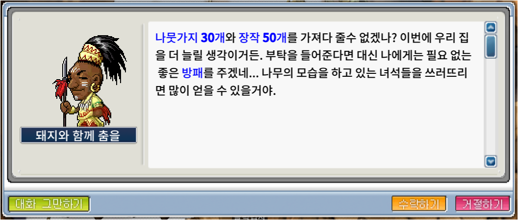 나뭇가지 30개와 장작 50개를 구했으면, 페리온으로 돌아와 완료를 받아주자.
