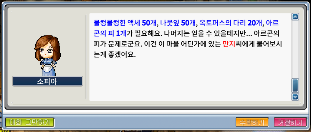 물컹물컹한 액체 50개, 나뭇잎 50개, 옥토퍼스의 다리 50개, 아르콘의 피 1개라..