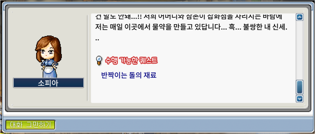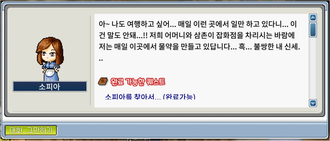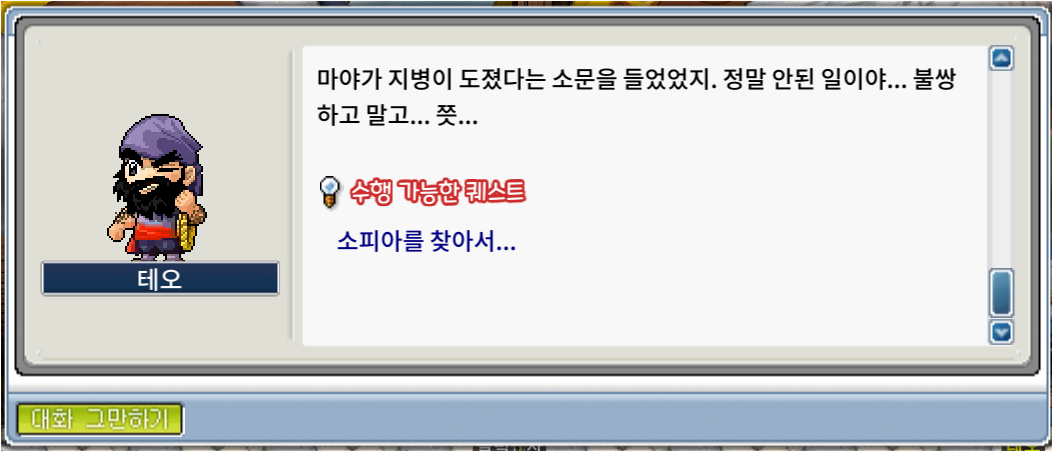 테오와 대화를 마치면 [소피아를 찾아서...] 라는 퀘를 준다.