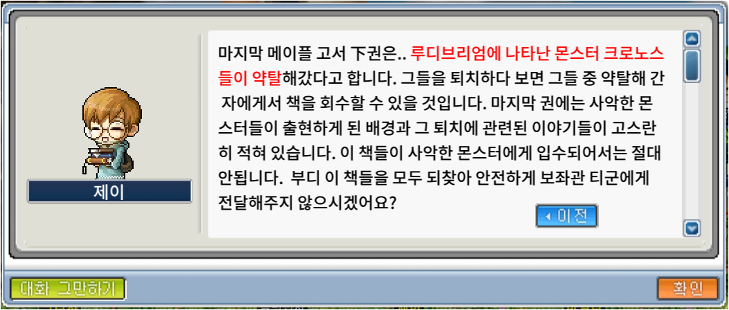 내용은 [메이플 고서] 세 권을 찾아서 루디브리엄의 보자관 티군에게 주면 된다고 한다.