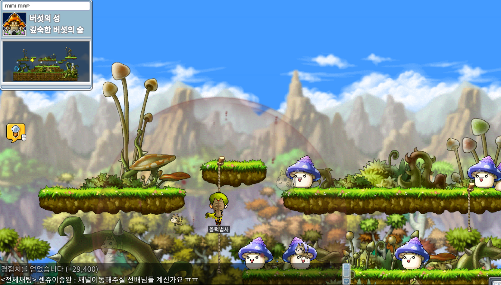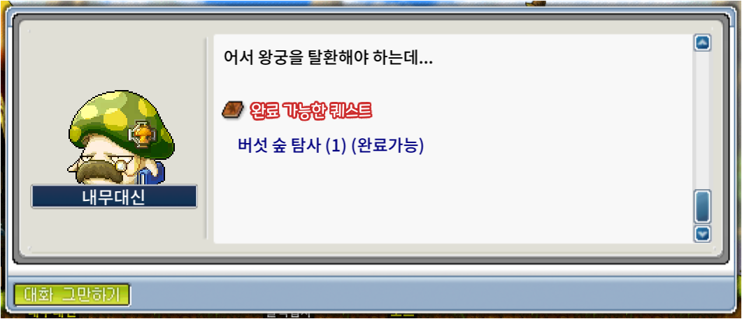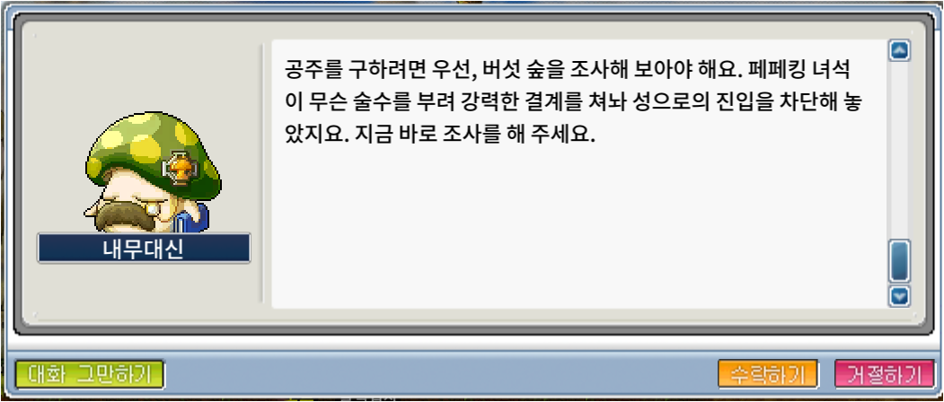 옆에 있는 마법대신에게 완료받고, 버섯 숲 탐사(3) 을 받는다.